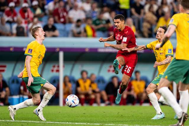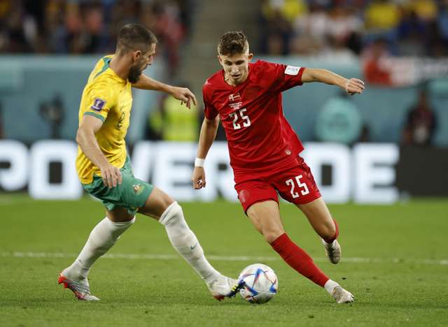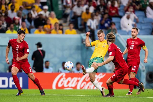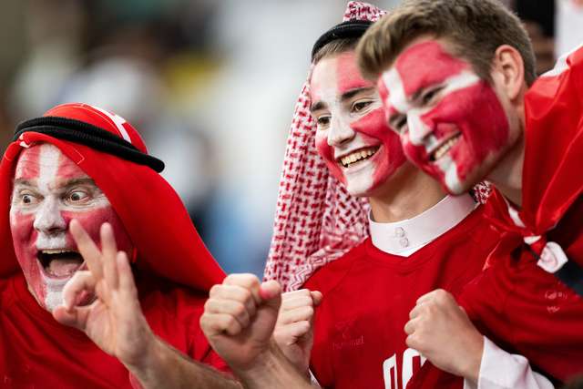 Com rosto pintado, torcedores da Dinamarca se divertem durante o jogo contra a Austrália. (FOTO: Joel Marklund / BILDBYRÅN / kod JM / JM0395)