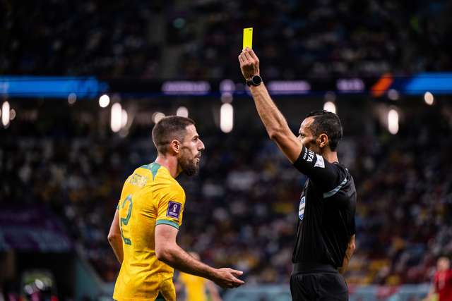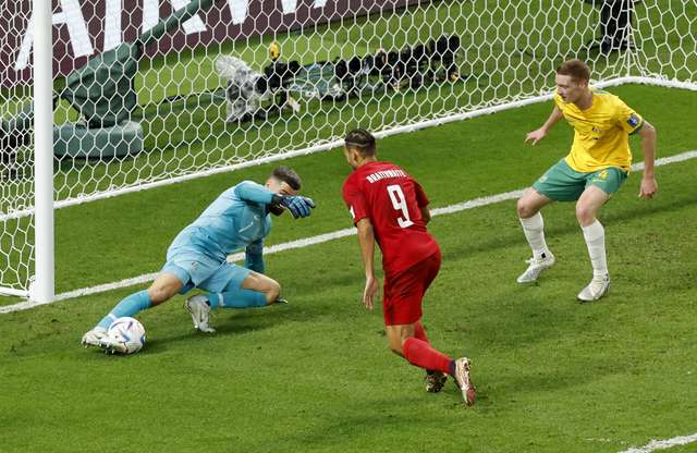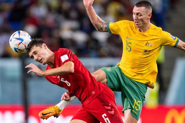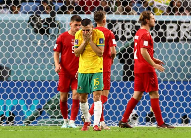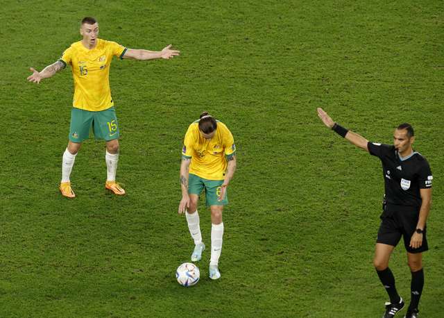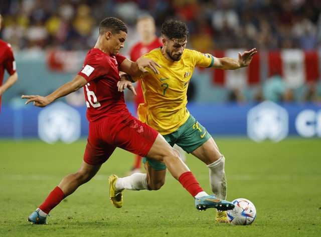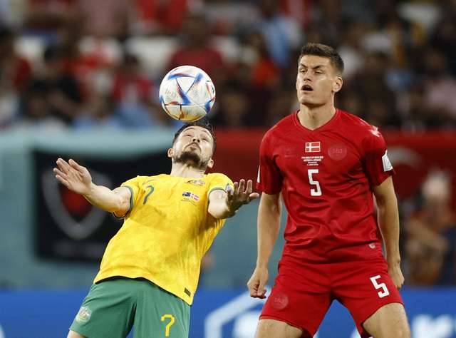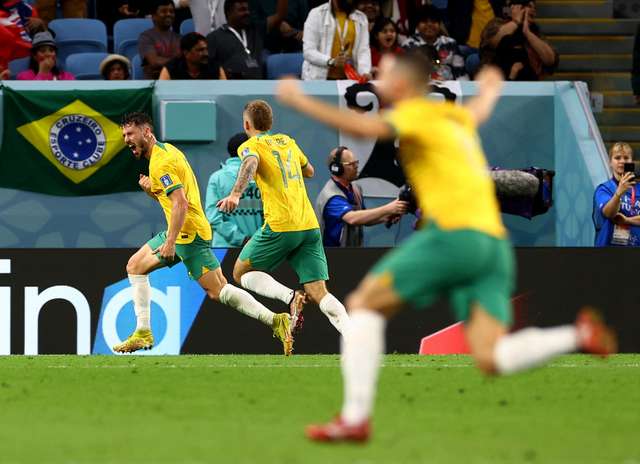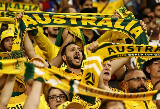 Torcedor da Austrália segura o mascote da Copa do Mundo do Catar, La'eeb. (FOTO: Hamad I Mohammed/Reuters)