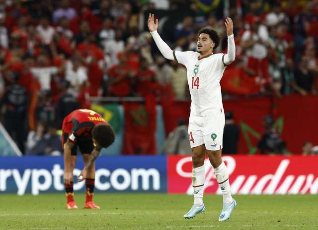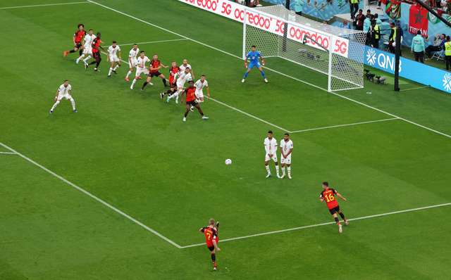 Gol! Bélgica 0, Morocco 1. Abdelhamid Sabiri (Morocco) Gol de falta com um finalização com o pé direito no canto inferior esquerdo. Foto: Reuters/Molly Darlington