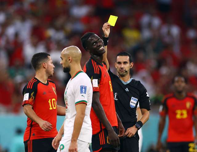 Amadou Onana (Bélgica) recebe cartão amarelo por uma entrada perigosa.