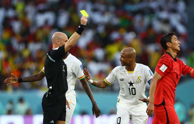 Jung Woo-young, da Coreia do Sul, recebe cartão amarelo do árbitro Anthony Taylor. É o segundo cartão da partida. Foto: Reuters/Kim Hong-Ji