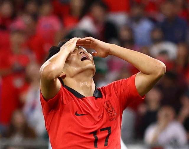Finalização bloqueada, Na Sang-Ho (Coreia do Sul) finalização com o pé esquerdo do lado direito da área. Assistência de Lee Kang-In. Foto: Reuters/Kim Hong-Ji
