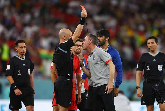 O técnico da Coreia do Sul, Paulo Bento, recebe cartão vermelho do árbitro Anthony Taylor após o apito final da partida. O técnico estava reclamando da decisão do árbitro de encerrar a partida antes da Coreia bater um último escanteio. Foto: Reuters/Kai Pfaffenbach