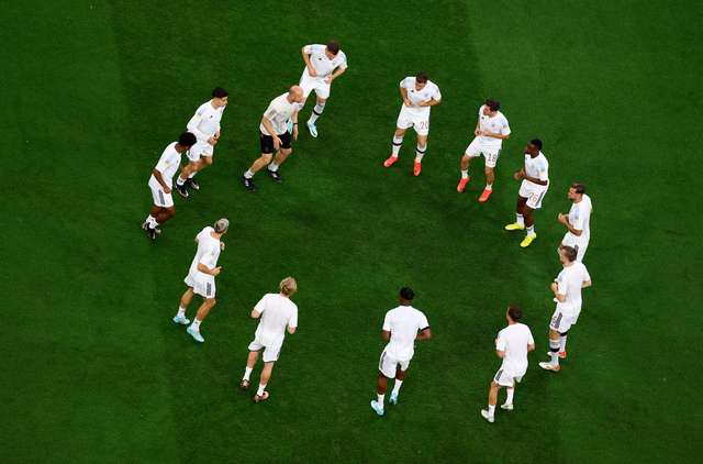 AQUECIMENTO DA ALEMANHA: Jogadores já estão em campo aquecendo para o jogo que começa às 16 horas (de Brasília). (FOTO: Molly Darlington/Reuters)