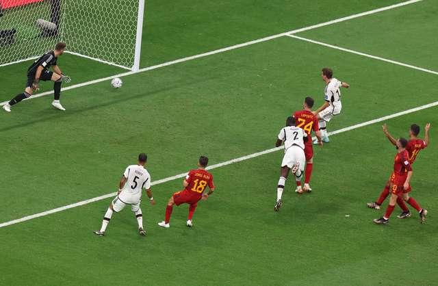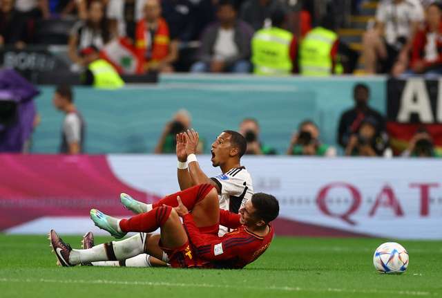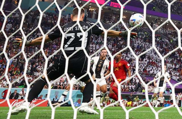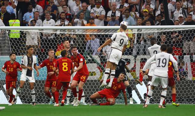 GOL CANCELADO PELO VAR: Antonio Rüdiger (Alemanha) marca, mas o gol é descartado após uma revisão do VAR. (FOTO: Molly Darlington/Reuters)