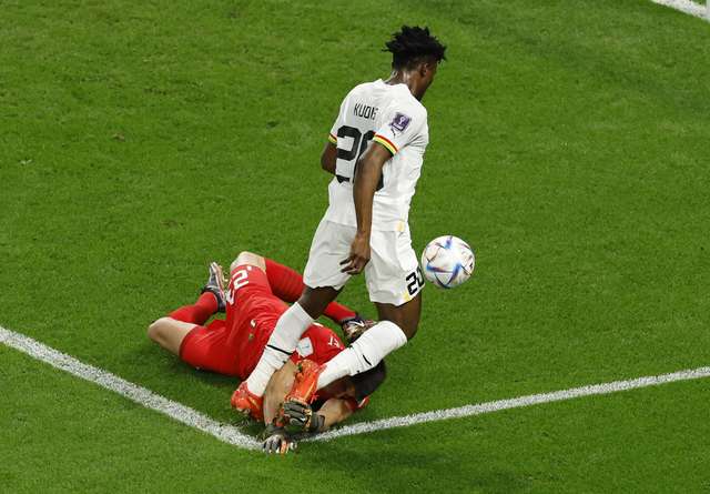 Pênalti Gana. Mohammed Kudus sofreu falta dentro da área.
