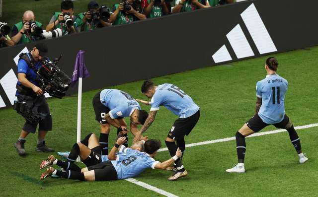 Giorgian de Arrascaeta, Uruguai, celebra o primeiro gol com os colegas de time. (FOTO: John Sibley/Reuters)