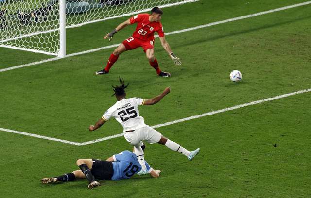Gol! Gana 0, Uruguai 1. Giorgian de Arrascaeta (Uruguai) de cabeça de muito perto para o centro do gol. (FOTO: Albert Gea/Reuters)