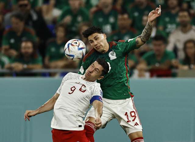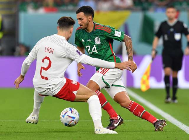 O mexicano Luis Chavez em ação com o polonês Matty Cash (FOTO: Jennifer Lorenzini/Reuters)