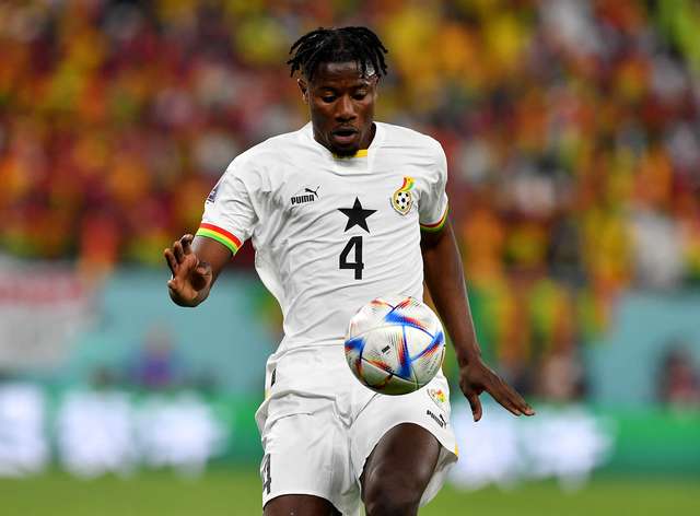 Mohammed Kudus (Gana) recebe cartão amarelo por uma entrada perigosa.