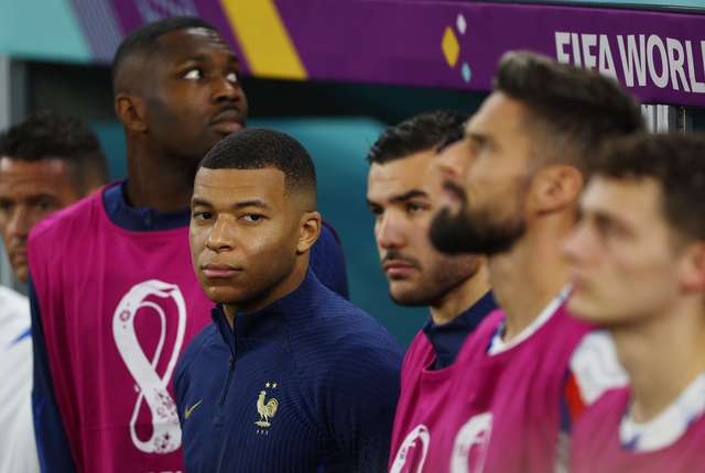 Impedimento, França. Randal Kolo Muani tentou um passe em profundidade que encontrou Kylian Mbappé em posição irregular.(Foto:Carl Recine/REUTERS)