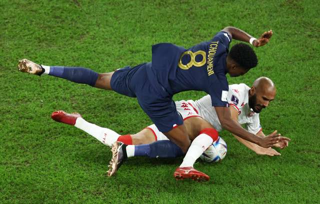 Aurélien Tchouaméni (França) sofre uma falta no campo defensivo.