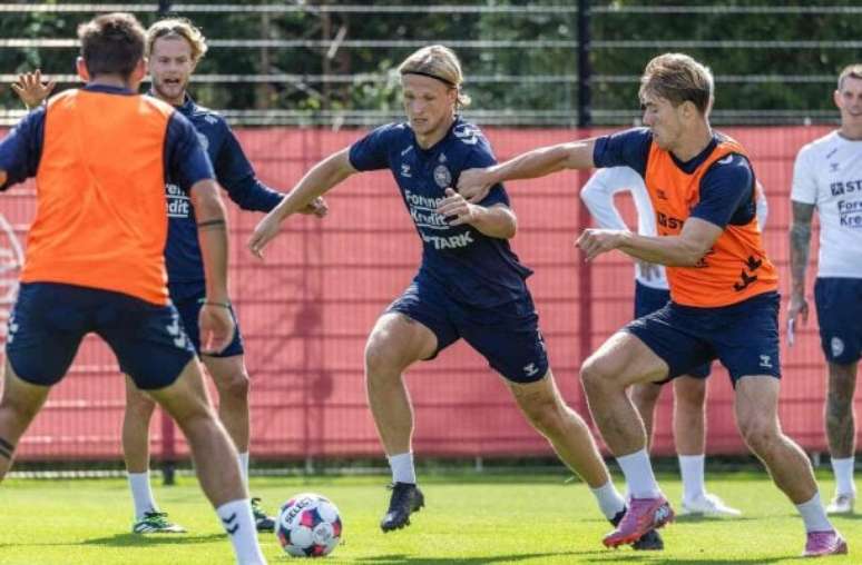 DINAMARCA: Schmeichel; Kristensen, Andersen, Vestergaard e Dorgu; Hojbjerg e Hjulmand; Dreyer, O'Riley e Dolberg; Biereth. Técnico: Brian Riemer.