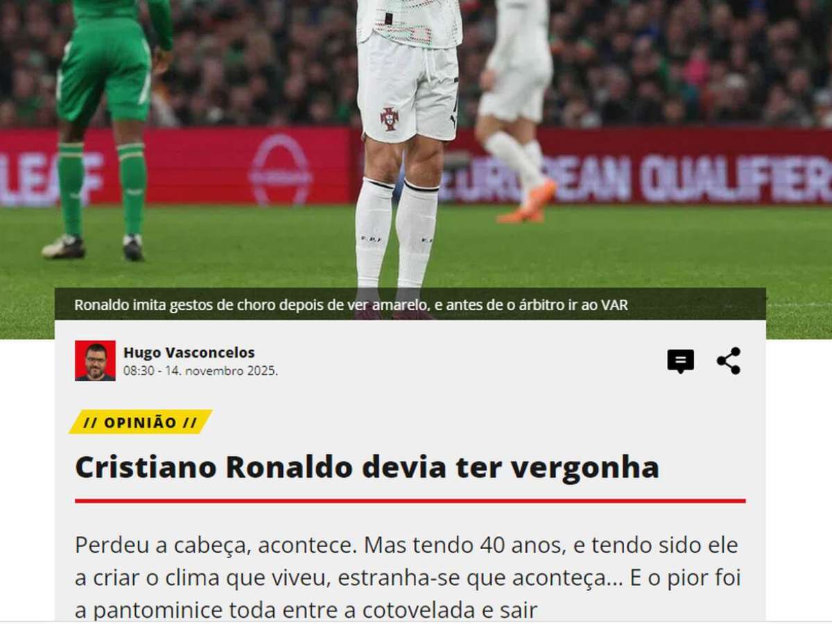 A expulsão inédita de Cristiano Ronaldo pela seleção portuguesa ainda gera duras críticas. Nesta sexta-feira (14/11), o tradicional jornal português "A Bola" publicou um artigo detonando o capitão. A fúria da imprensa, aliás, se deve à derrota de Portugal por 2 a 0 para a Irlanda, na quinta-feira (13/11). O resultado, inclusive, impediu a classificação antecipada da seleção para a Copa do Mundo de 2026.