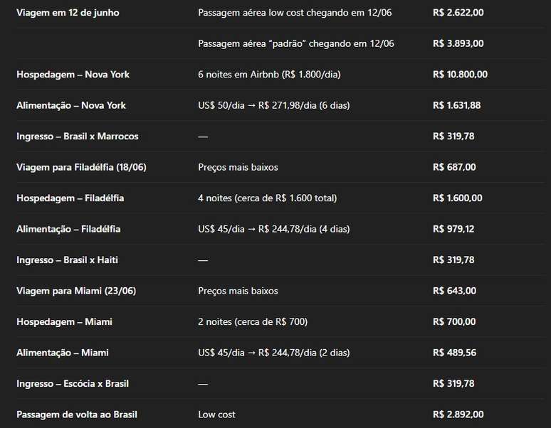Acabou a viagem! Só que ainda precisa comprar a volta ao Brasil. Indo embora em 25 de junho, o torcedor poderia achar uma 'pechinha' conseguir passagem por R$ 2.892, preço mais barato no Google Flights em dezembro de 2025. Assim, o total da aventura nos Estados Unidos fica entre R$ 15.002,24 e R$ 16.274,90. Vale a pena o gasto, torcedor?