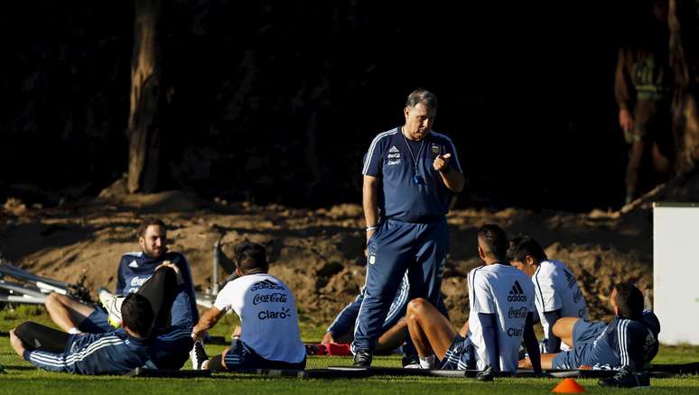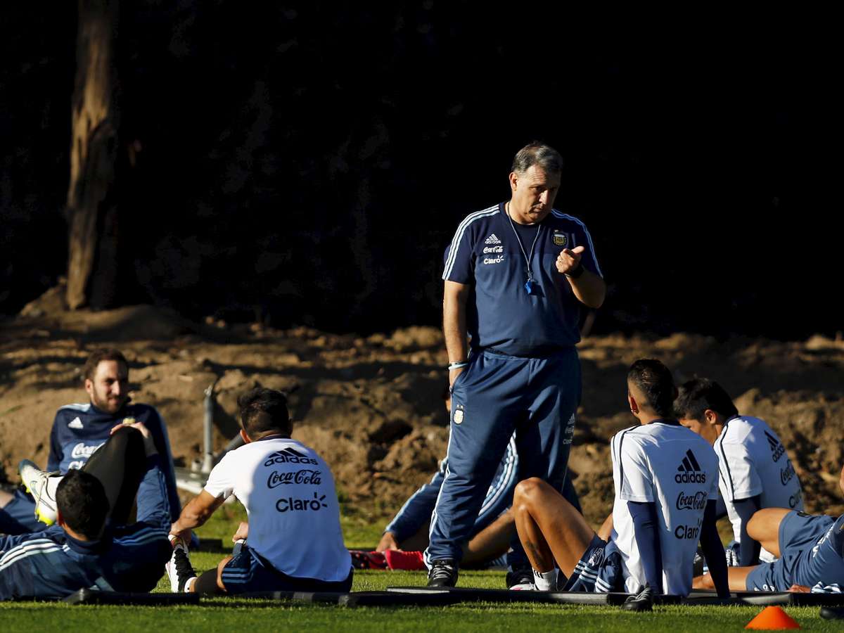 Gerardo Martino conversa com os jogadores em treino da Argentina