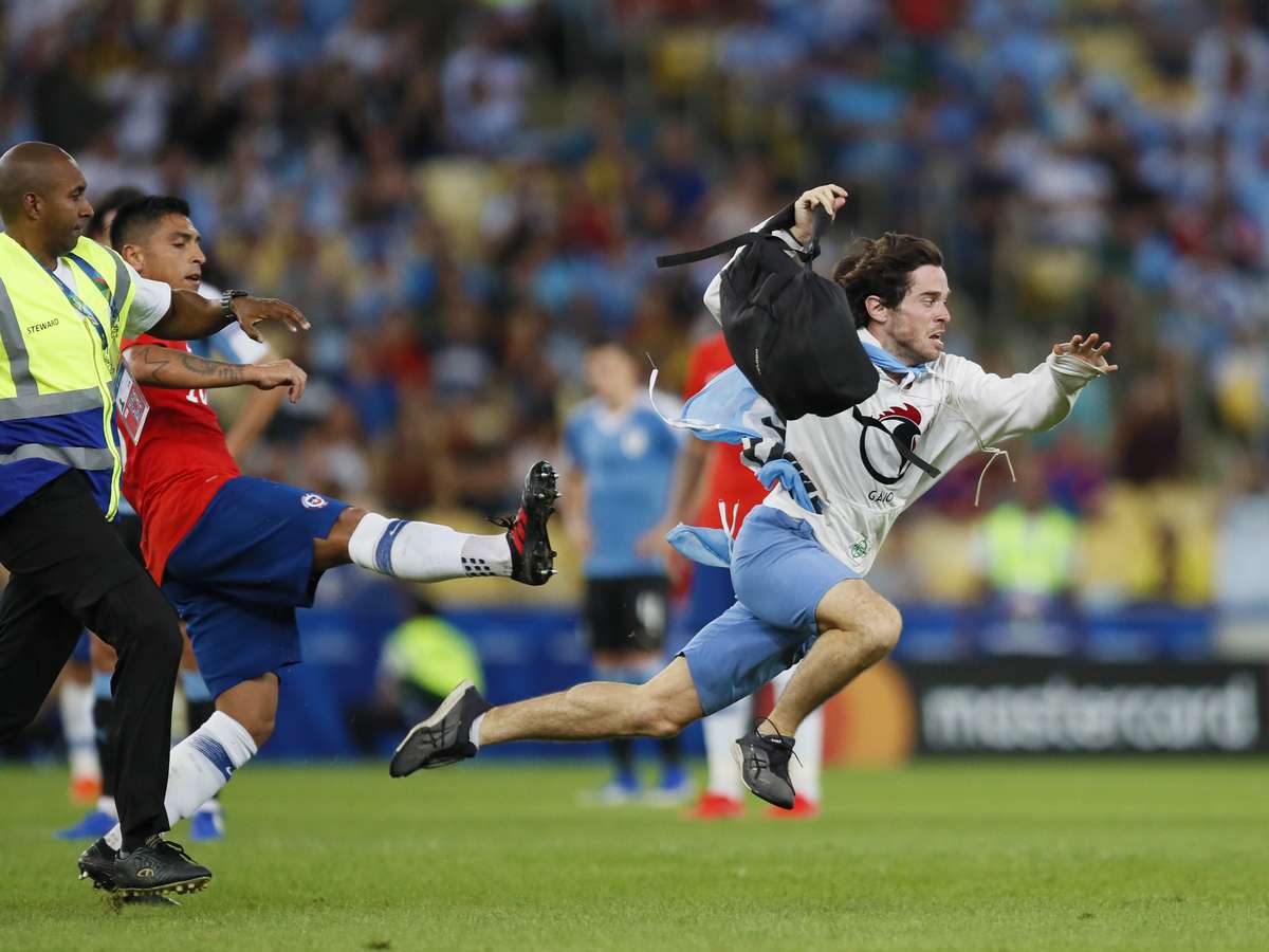 Um torcedor invadiu o gramado do Maracanã aos 28 minutos do segundo tempo durante o duelo entre Uruguai e Chile pela terceira rodada da Copa América. Quatro seguranças também entraram no gramado para tentar conter o invasor, mas levaram um baile.