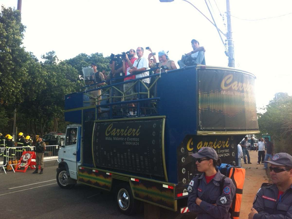 “Ei, você de camisa preta e rosto encapuzado. Não ultrapasse o perímetro. Você já está identificado pelas nossas câmeras”. Do alto de um carro de som posicionado a mais de 100 m da linha de bloqueio formada na Avenida Antônio Abrahão Caram, principal via de acesso ao Estádio do Mineirão, o chefe da sala de imprensa da Polícia Militar, Major Gilmar Luciano, tentou ajudar com um microfone o controle dos confrontos entre Polícia e manifestantes. As frases variaram desde a empolgação por um começo de protesto pacífico até o pedido para que caminhos fossem abertos para atendimento de feridos.