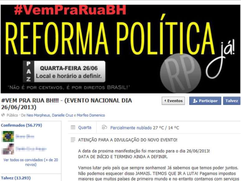 O #VempraruaBH, que tem como principal bandeira a Reforma Política, conta com mais de 56 mil pessoas que disseram sim ao convite de participação. Outras 13.260 colocaram a opção talvez, em uma indicação de que o movimento pode bater o recorde das outras duas manifestações ocorridas antes de Japão x México e Taiti x Nigéria. No sábado, estimativas apontaram para quase 100 mil pessoas nas ruas.