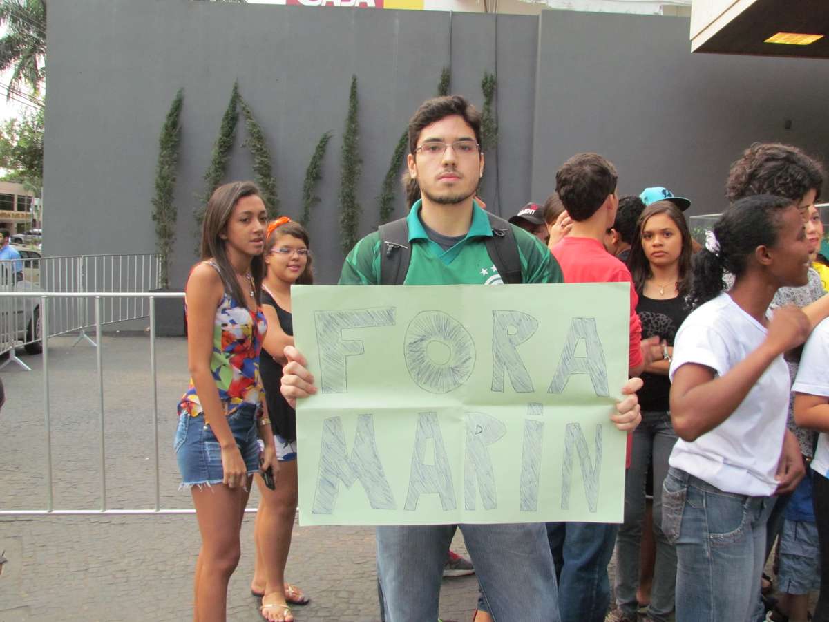Em meio à festa de cerca de 50 torcedores pela chegada da Seleção Brasileira ao hotel onde ficará concentrada em Goiânia pelos próximos dias, um outro torcedor destoava. Vestido com a camisa do Goiás e de cara amarrada, ergueu um cartaz com a frase "fora Marin", em protesto ao presidente da Confederação Brasileira de Futebol, José Maria Marin. Mucio Guimarães, 20 anos, explicou os motivos da manifestação quase silenciosa e que destoou dos demais na tarde desta segunda-feira.