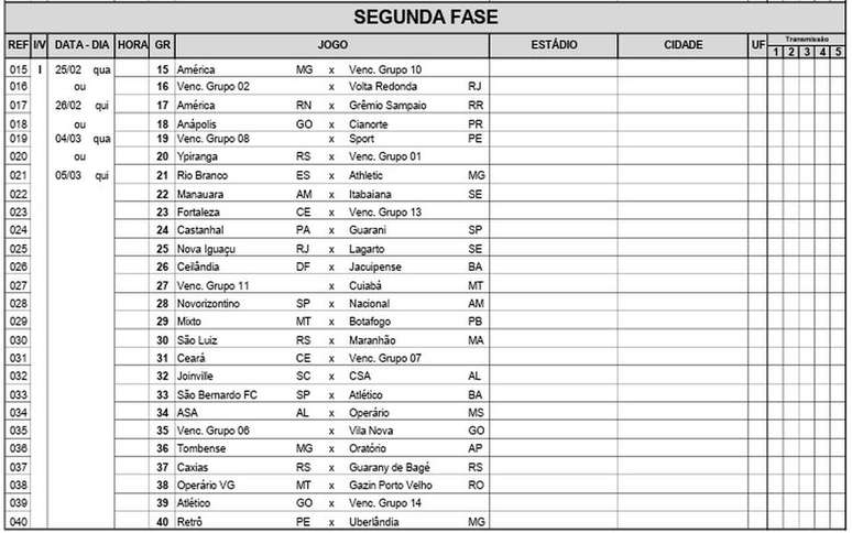Nesta etapa inicial, aliás, serão 28 clubes brigando por 14 vagas na segunda fase. Lembrando que, nesta primeira fase, os jogos que terminarem empatados serão definidos nos pênaltis. Já a segunda etapa da competição não tem datas definidas, ainda que tenham datas-base. Serão nos dias 25 e 26/2 e 4 e 5/3.