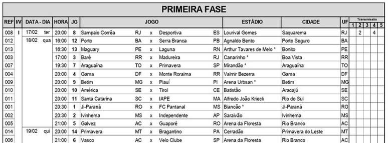 A CBF divulgou nesta segunda-feira (9/2) a tabela detalhada da primeira fase da Copa do Brasil, que começa já no dia 17 de fevereiro. O jogo de abertura fira por conta de Sampaio Corrêa-RJ x Desportiva-ES, no Lourival Gomes, em Saquarema (RJ). A partida ocorre às 20h (de Brasília) e será a única da terça-feira. Na quarta (18/2), mais 11 duelos ocorrem nas cinco regiões do Brasil. Por fim, duas partidas serão na quinta (19/2).
