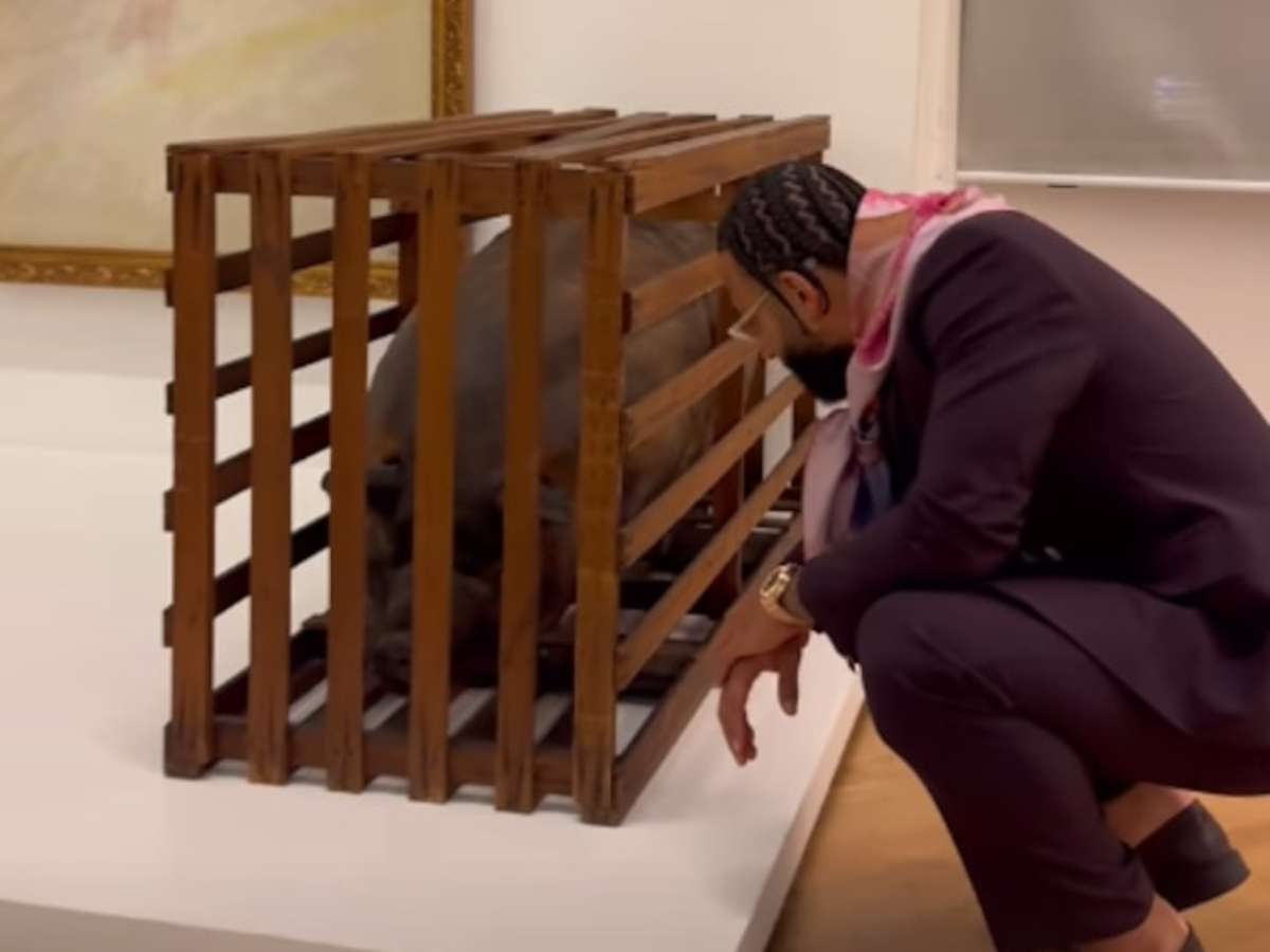 Na imagem, Memphis faz um gesto com as mãos em direção à obra. O nome da escultura é "O Porco", do paulistano Nelson Leirner, morto em 2020, e apresenta um engradado de madeira e porco empalhado. Ela data de 1967.