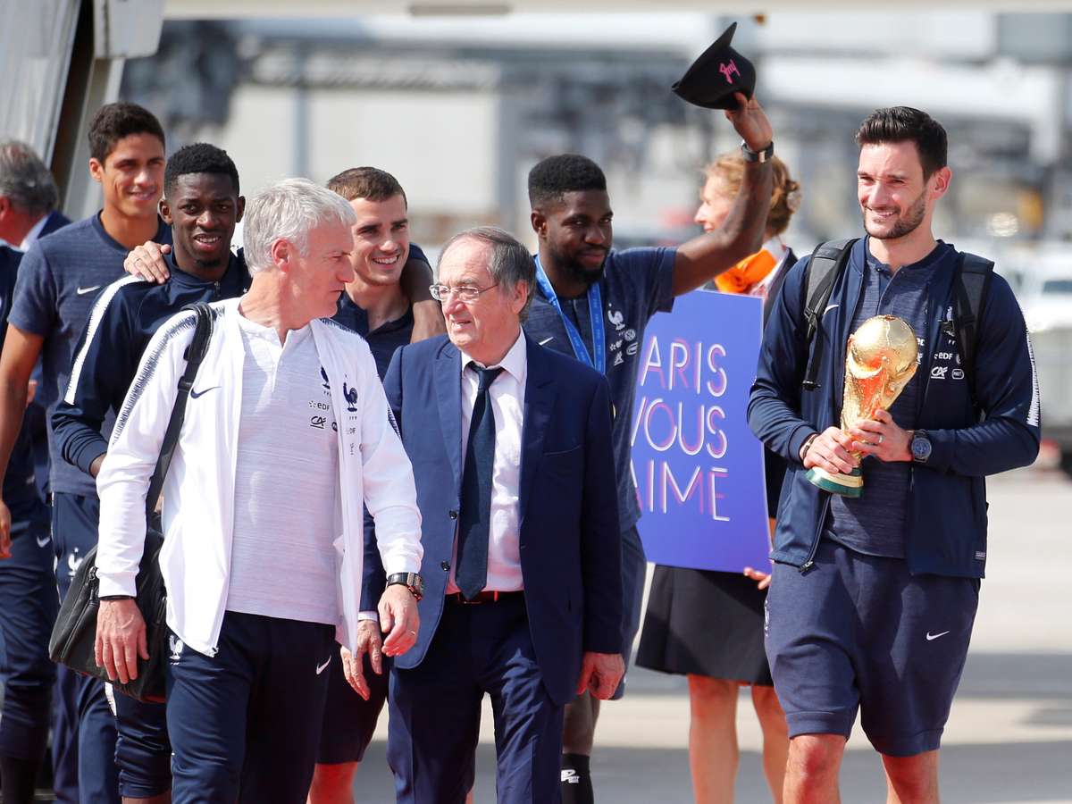 A ministra de Esportes francesa, Laura Flessel, foi a encarregada de receber a delegação na porta do avião. O goleiro Hugo Lloris, capitão da equipe, foi o primeiro a descer, com o troféu na mão, ao acompanhado pelo técnico, Didier Deschamps, e pelo presidente da Federação Francesa de Futebol (FFF), Noël Le Graët.