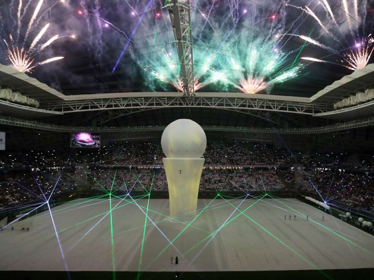 Um vídeo contando a história do país foi projetado em dois telões. A cobertura retrátil do estádio - inspirada nas velas dos barcos de pesca - é composta de 1.400 peças, vindas da Itália.