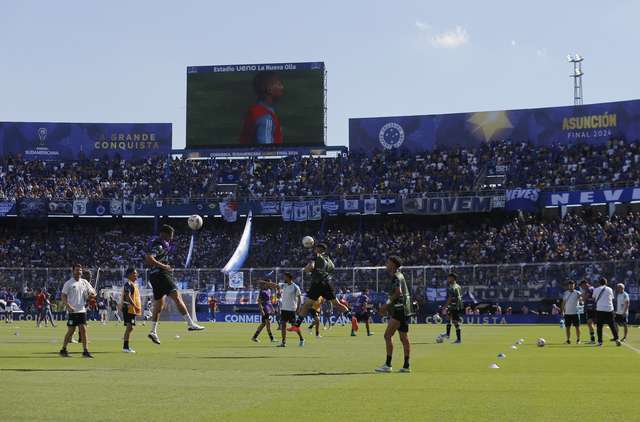 Jogadores de Cruzeiro e Racing fazem aquecimento antes da grande final da Copa Sul-Americana. Foto: Cesar Olmedo/Reuters