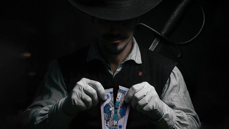 O clube paulista compartilhou a imagem de um mosqueteiro, mascote do time, rasgando uma carta azul e branca do rei de copas.