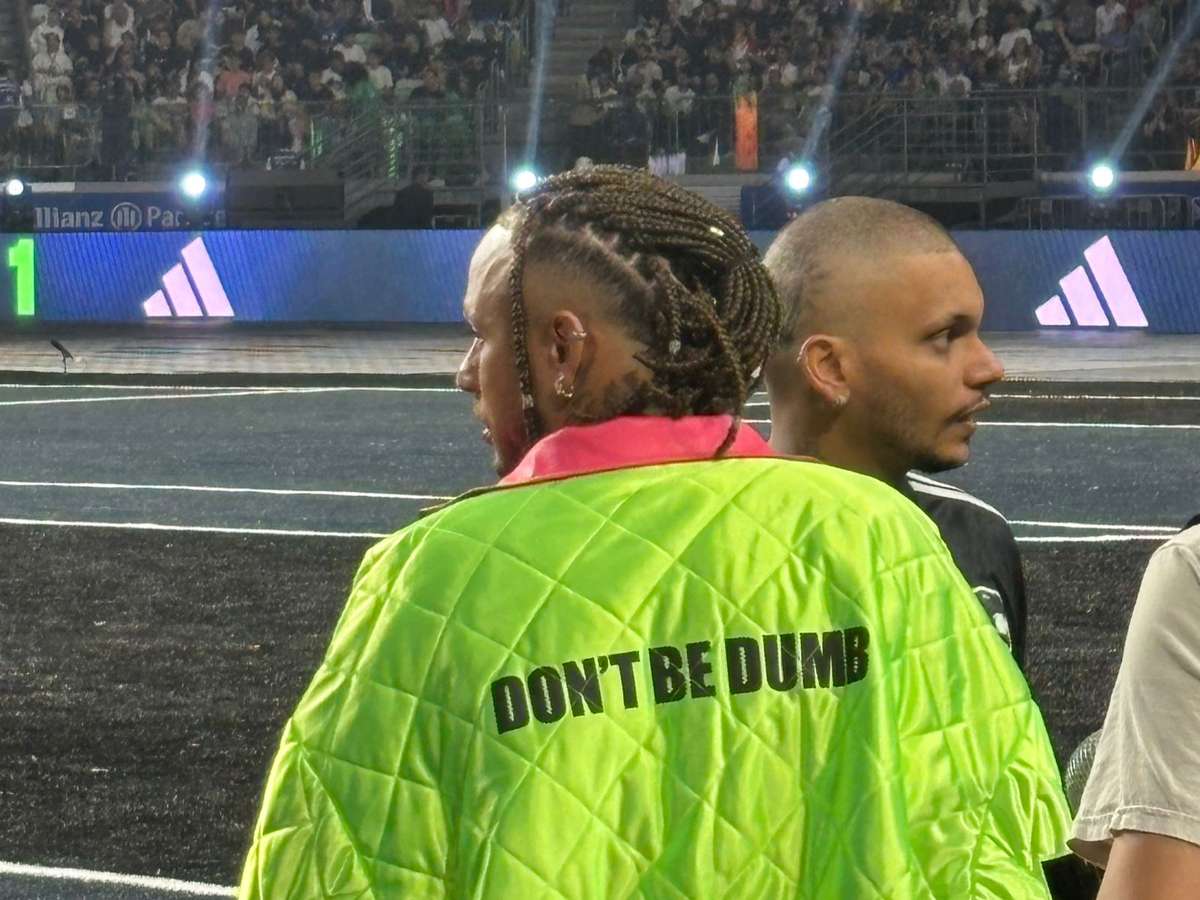 Em meio às críticas, Neymar chegou ao Allianz Parque de visual renovado. Sem moicano, o craque apostou em tranças e usou uma jaqueta com a mensagem “não seja burro”.