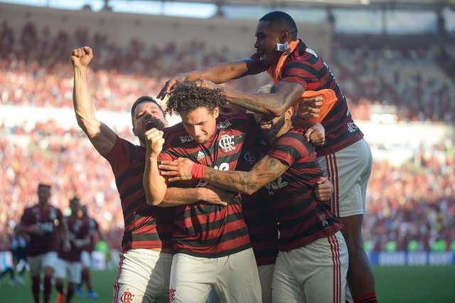 Com este resultado de 1 a 0, o Flamengo vai se tornando o campeão carioca. No jogo de ida, no Engenhão, o time rubro-negro venceu o Vasco por 2 a 0. Para levar a decisão para os pênaltis, os cruz-maltinos precisam virar para 3 a 1. Na imagem, Willian Arão comemora seu gol com os companheiros (Foto: CLEVER FELIX/AGÊNCIA O DIA/ESTADÃO CONTEÚDO)