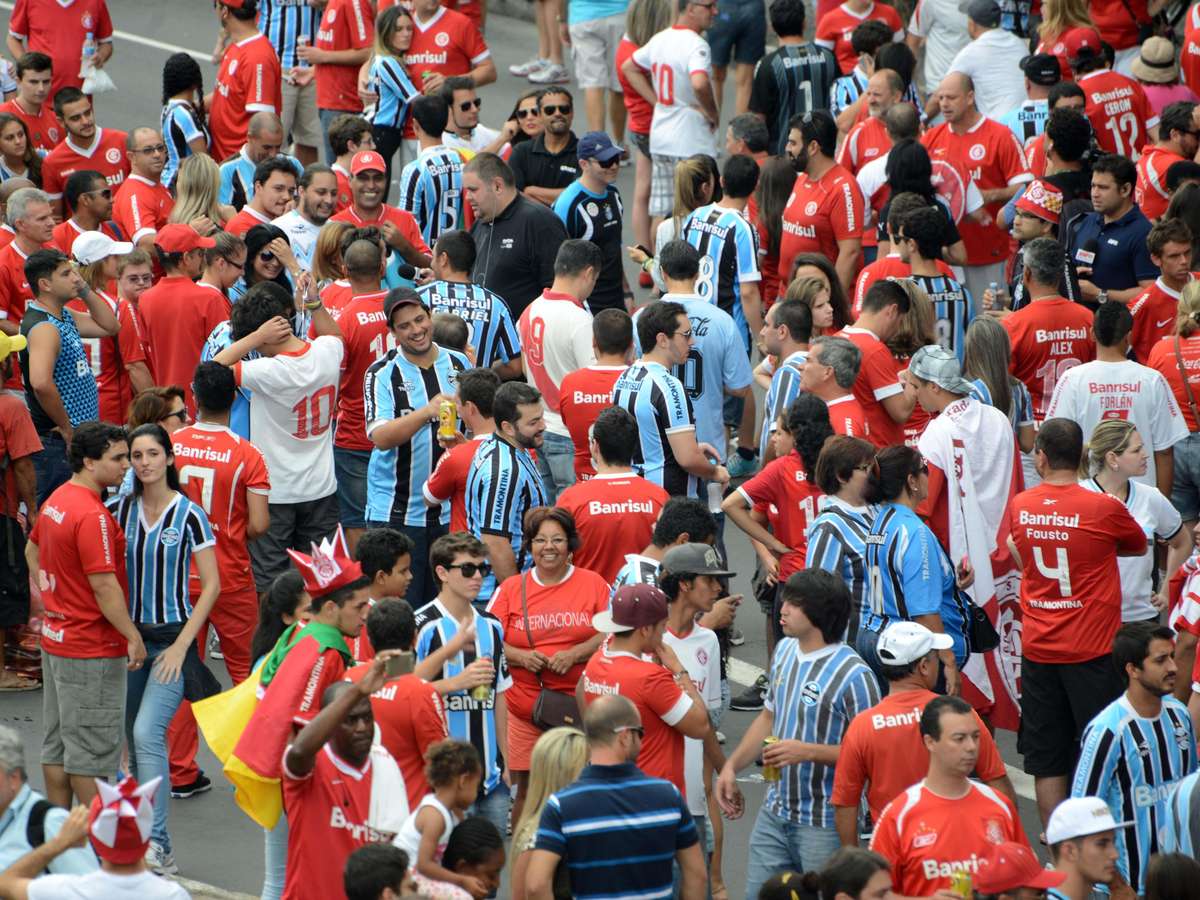 O clássico gaúcho deste domingo foi promovido como o "Gre-Nal da paz", com a presença de torcida mista de gremistas e colorados em um dos setores do Beira-Rio. Mas nem todos os torcedores contribuíram para o espetáculo. Um grupo de organizados do Grêmio que vinha do Estádio Olímpico começou a depredar veículos ao se aproximar do Beira-Rio e começou uma confusão com a Brigada Militar.