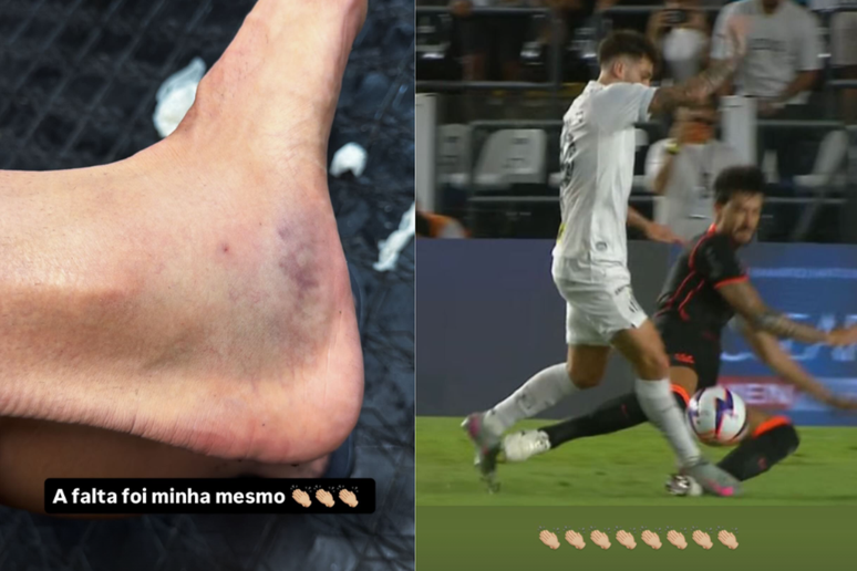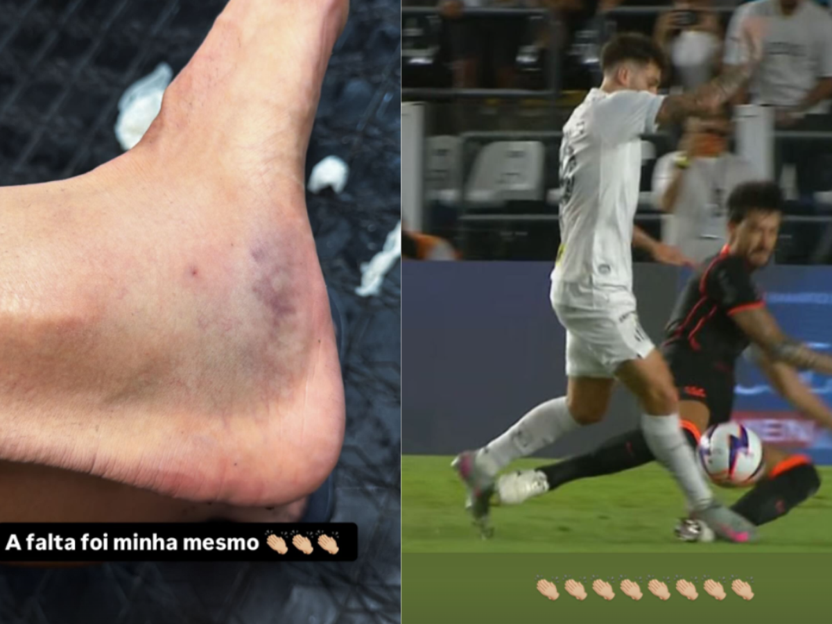 A imagem publicada por Gustavo Henrique mostra um hematoma no pé esquerdo do jogador. Na postagem seguinte, ele exibiu uma foto da dividida com Lautaro Díaz, em que aparece sendo pisado pelo atleta do Peixe.