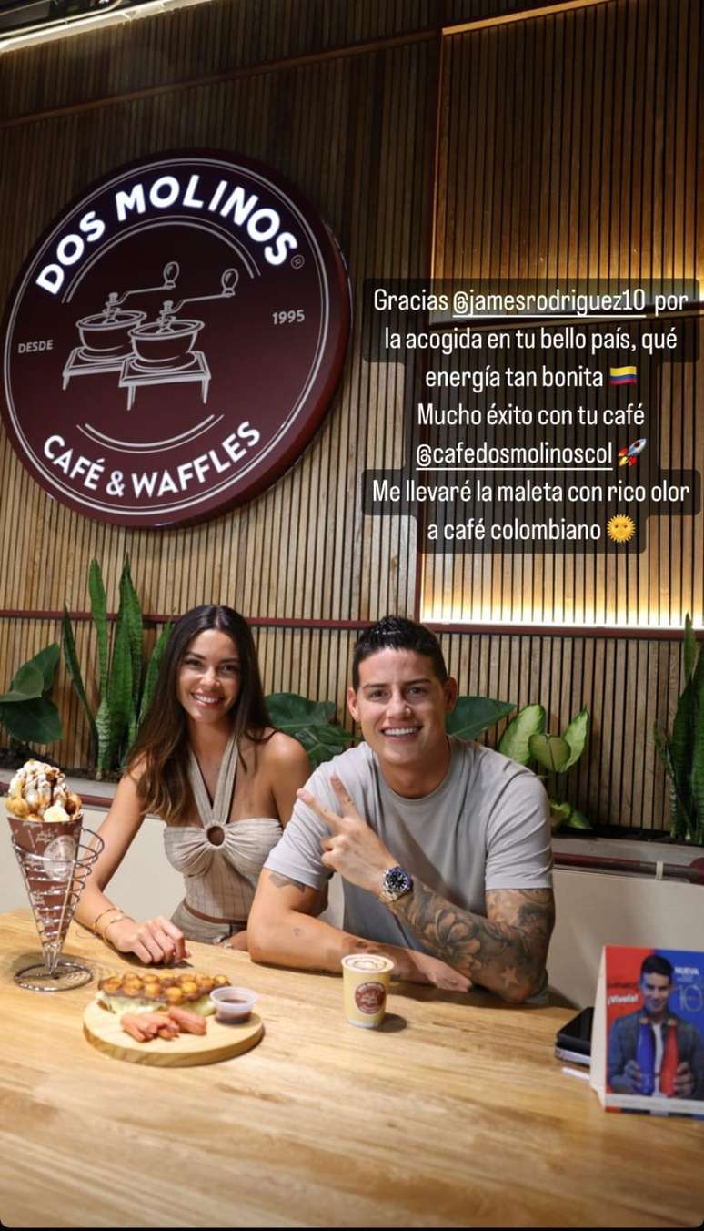 "Obrigado, James Rodríguez pela acolhida em seu belo país, que energia tão bonita. Muito êxito com seu café. Vou levar em minha mala o rico café colombiano", escreveu a modelo.