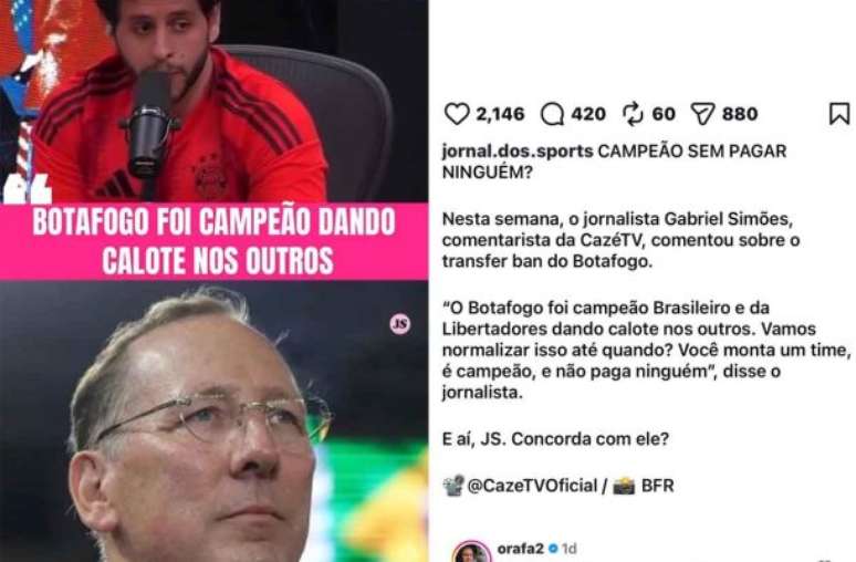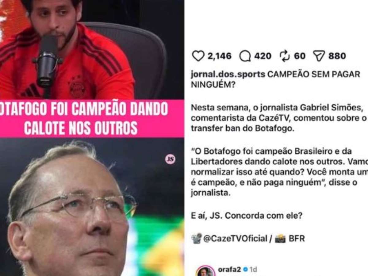 Ex-jogador do Botafogo, Rafael criticou as falas do jornalista Gabriel Simões, da CazéTV. O comunicador, durante um programa, disse que o Glorioso foi campeão brasileiro e da Copa Libertadores "dando calote". O comentário ocorreu por causa da dívida do clube carioca com o Atlanta United, dos Estados Unidos, na compra de Thiago Almada, o que provocou a punição com transfer ban.