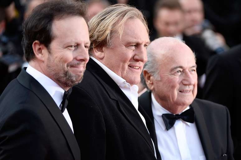 Diretor Fréderic Auburtin, ator Gerard Depardieu e Joseph Blatter em pré-estreia do filme da Fifa