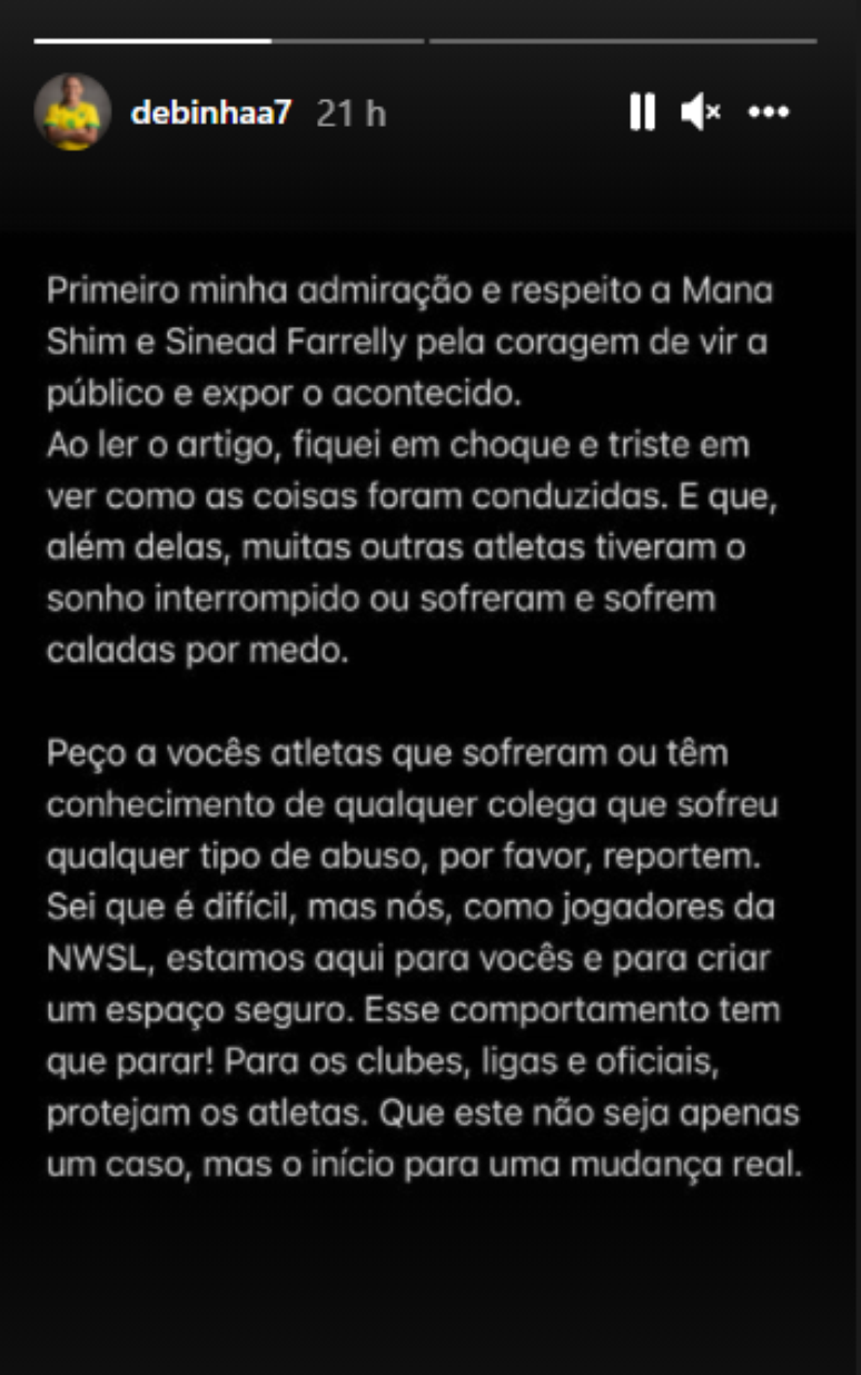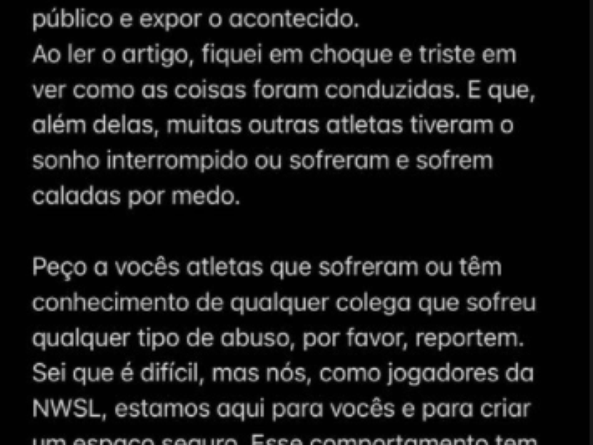 "Peço a vocês atletas que sofreram ou têm conhecimento de qualquer colega que sofreu qualquer tipo de abuso, por favor, reportem. Sei que é difícil, mas nós, como jogadoras da NWSL, estamos aqui para vocês e para criar um espaço seguro. Esse comportamento tem que parar! Para os clubes, ligas e oficiais, protejam as atletas. Que este não seja apenas um caso, mas o início para uma mudança real", completou.