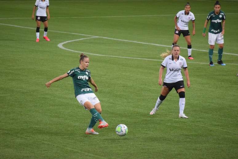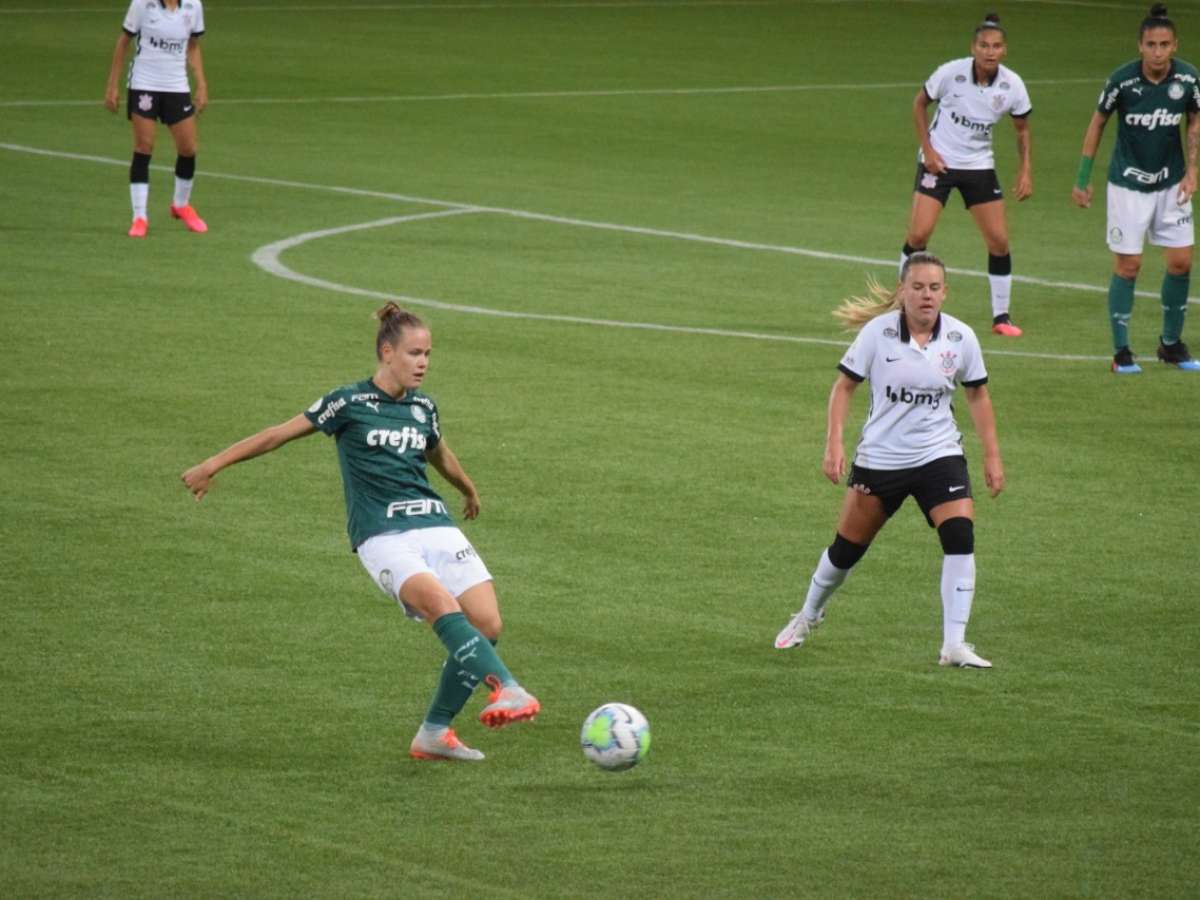 Mesmo atuando fora de casa, o Timão ficou em cima do Verdão em todo o primeiro tempo. A equipe comandada pelo técnico Arthur Elias se manteve no campo de ataque para tentar achar espaços, mas não conseguiu vazar o gol defendido por Vivi. Já as donas da casa encontraram dificuldades na troca de passes quando tiveram chances de sair mais para o jogo.
