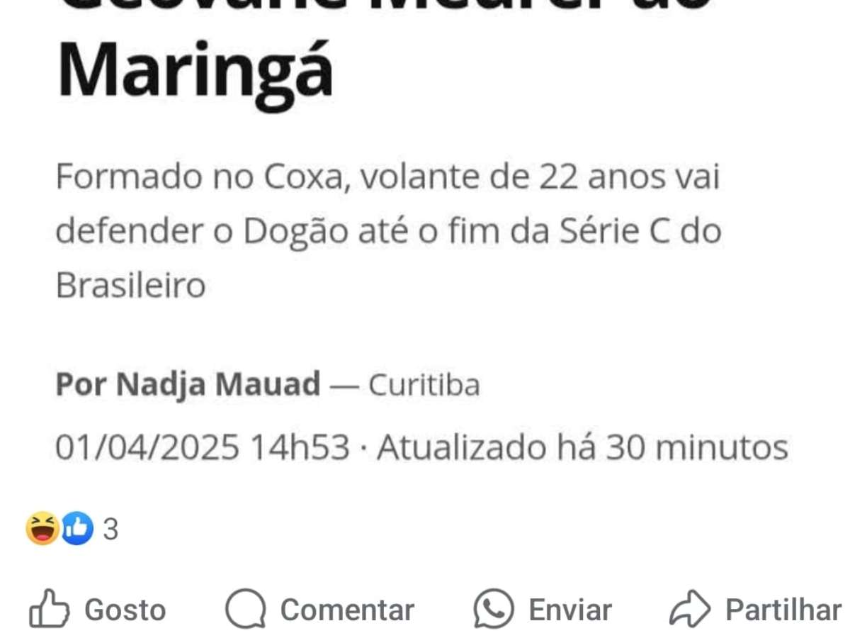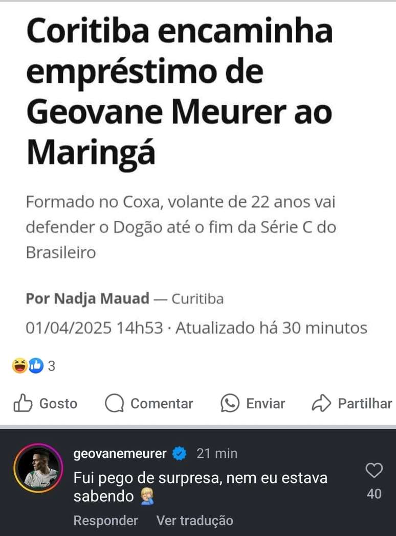 Nos bastidores, o Coxa negocia a transferência por empréstimo do volante ao Maringá. Nas redes sociais, o atleta demonstrou espanto ao saber das tratativas.