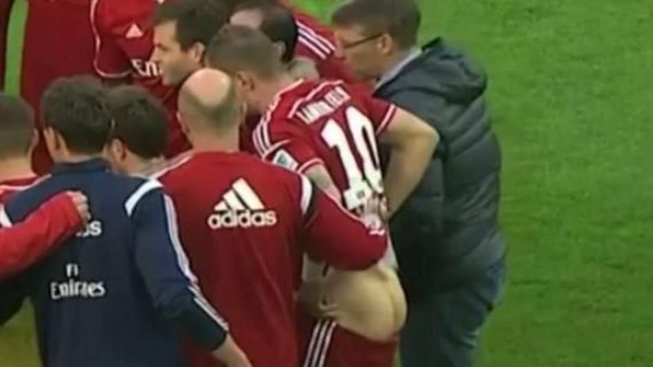 Meia-atacante do Hamburgo Pierre-Michel Lasogga ganhou uma massagem no bumbum antes da prorrogação contra o Karlsruhe; o time dele venceu a partida e se livrou do rebaixamento na Bundesliga
