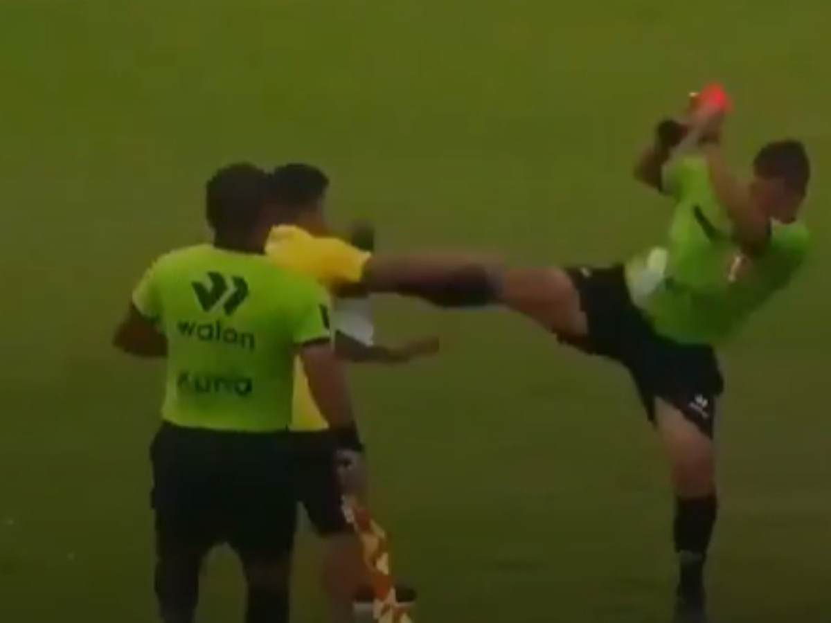 ⏩ El juez Luis Alegre perdió los estribos y arremetió con una espectacular “patada voladora” contra un integrante del cuerpo técnico rival pic.twitter.com/VcYrv2DEnn