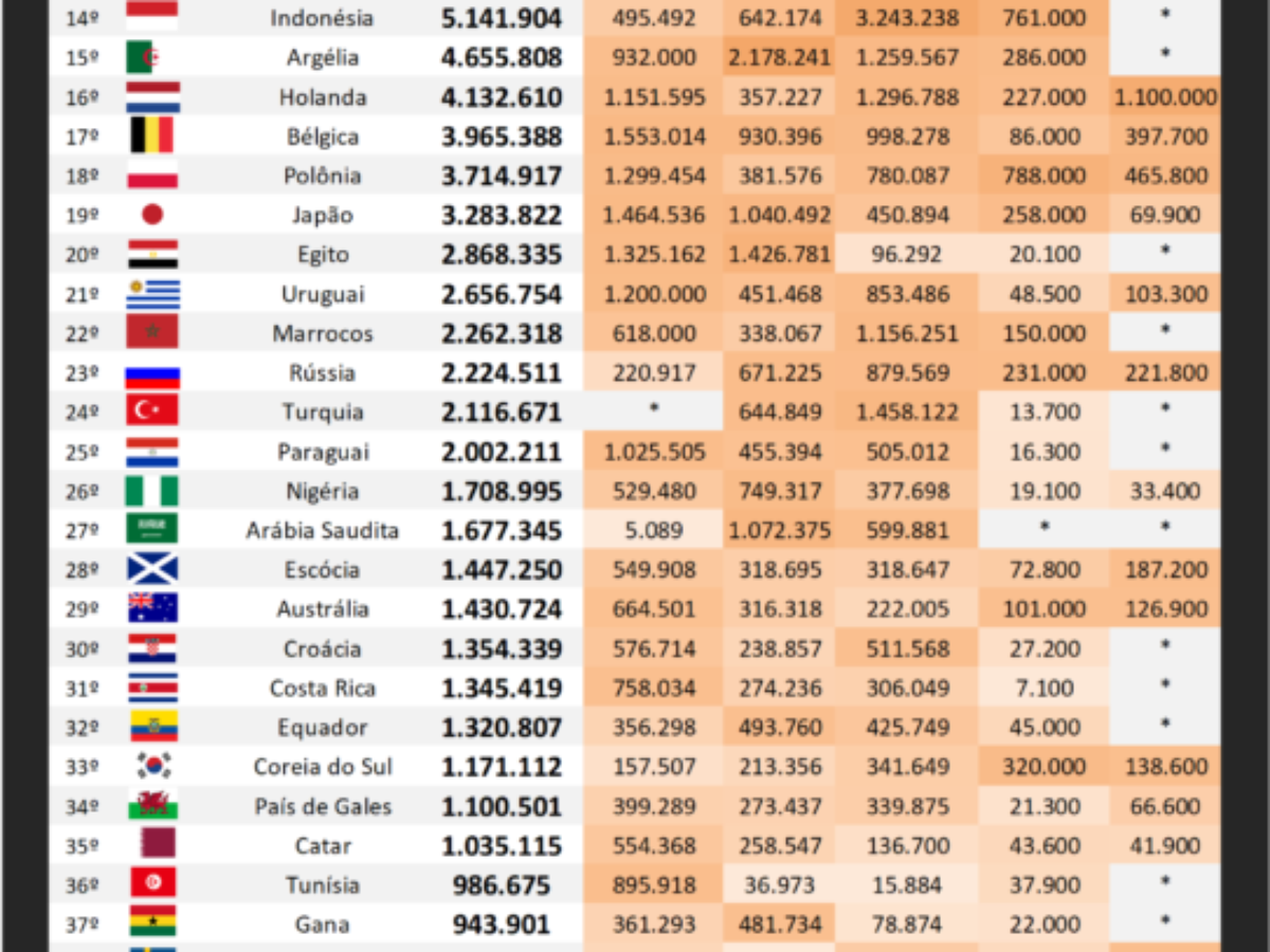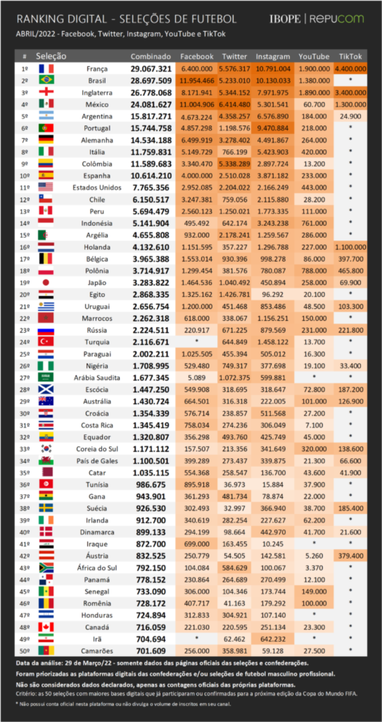 Com o final das eliminatórias Sul-americanas e na iminência do sorteio dos grupos da Copa do Mundo FIFA no Catar, o IBOPE Repucom divulga a edição 2022 do ranking digital das 50 seleções de futebol que já participaram de Copas do Mundo FIFA.