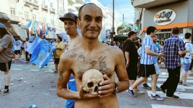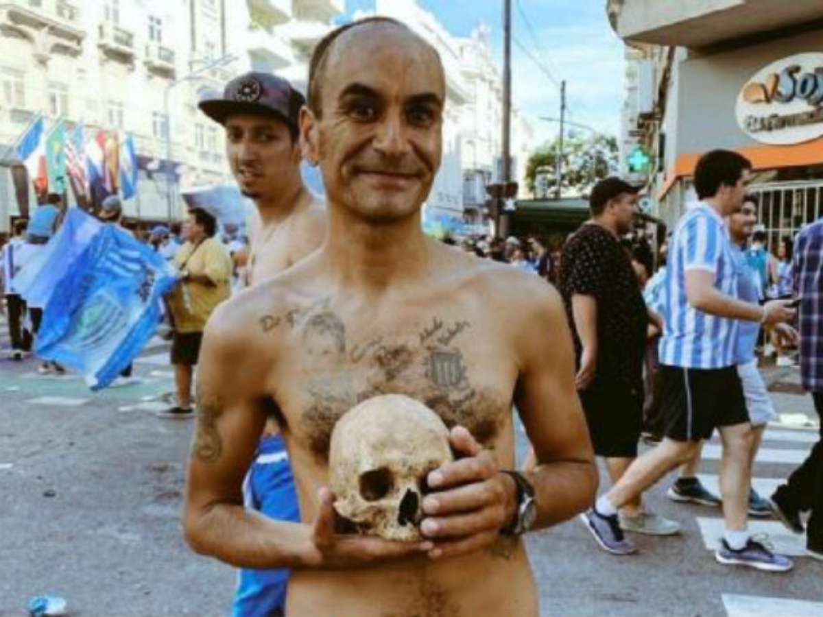 O Racing foi campeão do Campeonato Argentino, neste domingo, após empatar com o Tigre, em 1 a 1 e o Defensa y Justicia também empatar com o Unión Santa Fé. Após a partida, a torcida do time saiu às ruas de Buenos Aires para comemorar. Um torcedor, no entanto, chamava a atenção por estar com um crânio.