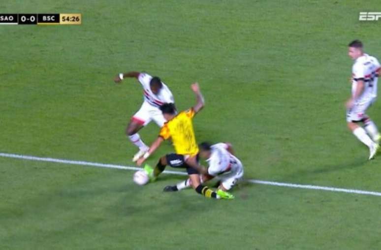 Na hora, além da possibilidade de marcação de pênalti, jogadores e demais integrantes do time equatoriano reclamaram da intensidade da falta. Com isso, também se pediu energicamente o cartão vermelho para o lateral-direito do São Paulo. Entretanto, a arbitragem o advertiu apenas com um amarelo e apontou a infração fora da área.