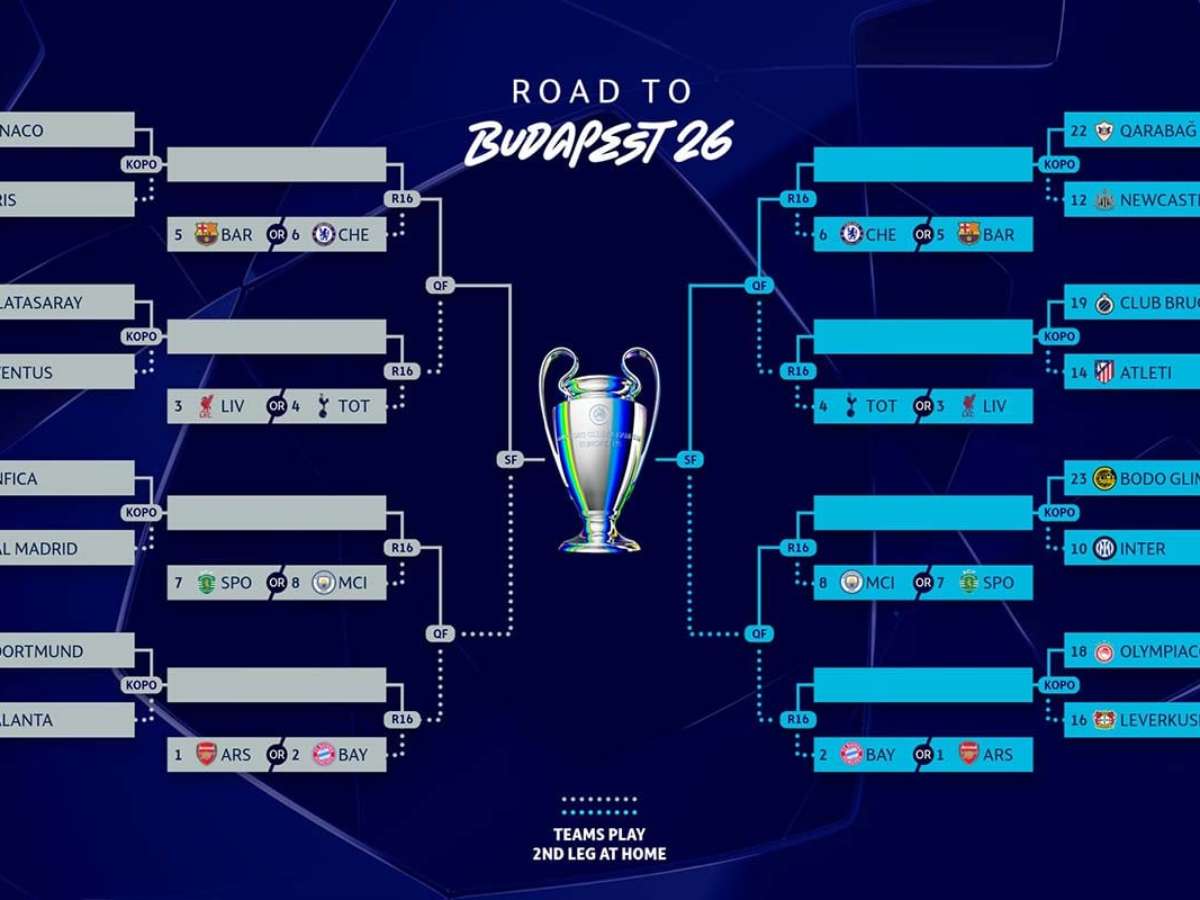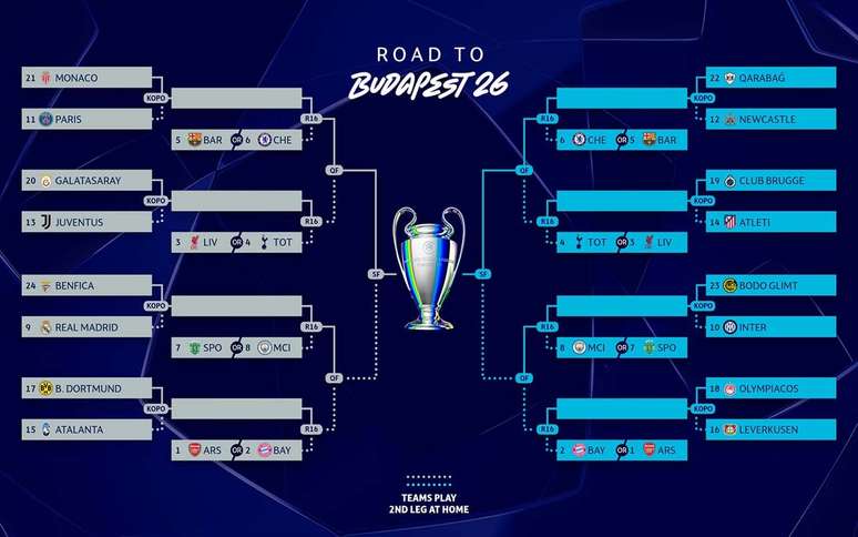 Além disso, o sorteio definiu outros sete embates. O Monaco enfrenta o Paris Saint-Germain, enquanto o Galatasaray mede forças com a Juventus. Na Alemanha, o Borussia Dortmund recebe a Atalanta. Já o Qarabag encara o Newcastle, ao passo que o Club Brugge enfrenta o Atlético de Madrid. Por sua vez, o Bodo/Glimt terá pela frente a Inter de Milão, e o Olympiakos contará com o apoio da torcida contra o Bayer Leverkusen.