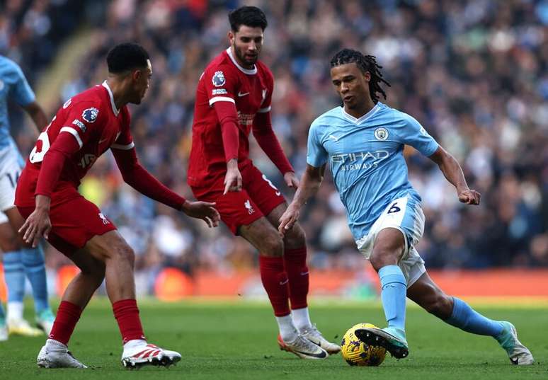 O Manchester City soube aproveitar os erros do Liverpool nas saídas de bola contra a sua marcação alta para sair na frente. Depois de 20 minutos de pouco sucesso e apenas uma finalização perigosa, de Foden, os Citizens começaram a pressionar e a levar o goleiro Alisson ao erro. Na primeira, o brasileiro, ao receber uma bola atrasada, quase a perdeu em cima da linha para Haaland. Na segunda, aos 26, tentou a sua tradicional ligação direta para Salah, mas não deu certo. Aké roubou a bola e tocou para Haaland na entrada da área. O chute do norueguês foi com força, Alisson chegou a tocar na bola, mas não deu. City 1 a 0.