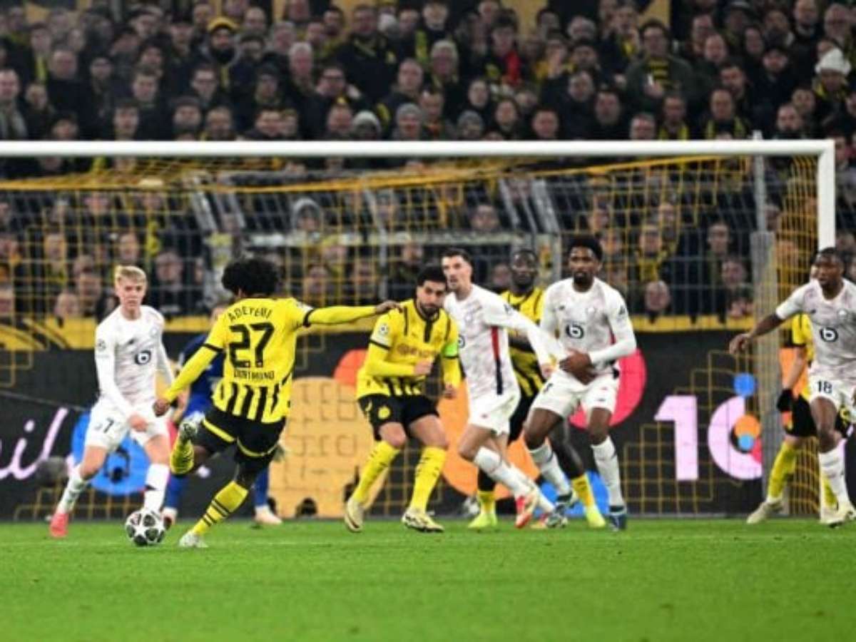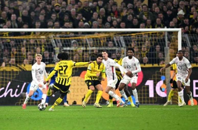 Apesar de jogar fora de casa, o Lille não se furtou a ir ao ataque e, com Ethan Mbappé (irmão mais novo do craque do Real Madrid) e Jonathan David, deu trabalho à defesa do Dortmund nos primeiros minutos. No entanto, o time alemão jogava em casa e tinha total apoio da imensa maioria do estádio lotado. E fez a alegria da torcida quando, aos 31 minutos, após escanteio pela direita, a defesa recuou para a entrada da área, onde apareceu Adeyemi. De canhota, o camisa 27 pegou de primeira. A bola ainda bateu na trave direita de Chevalier, que teve poucas chances de defesa.