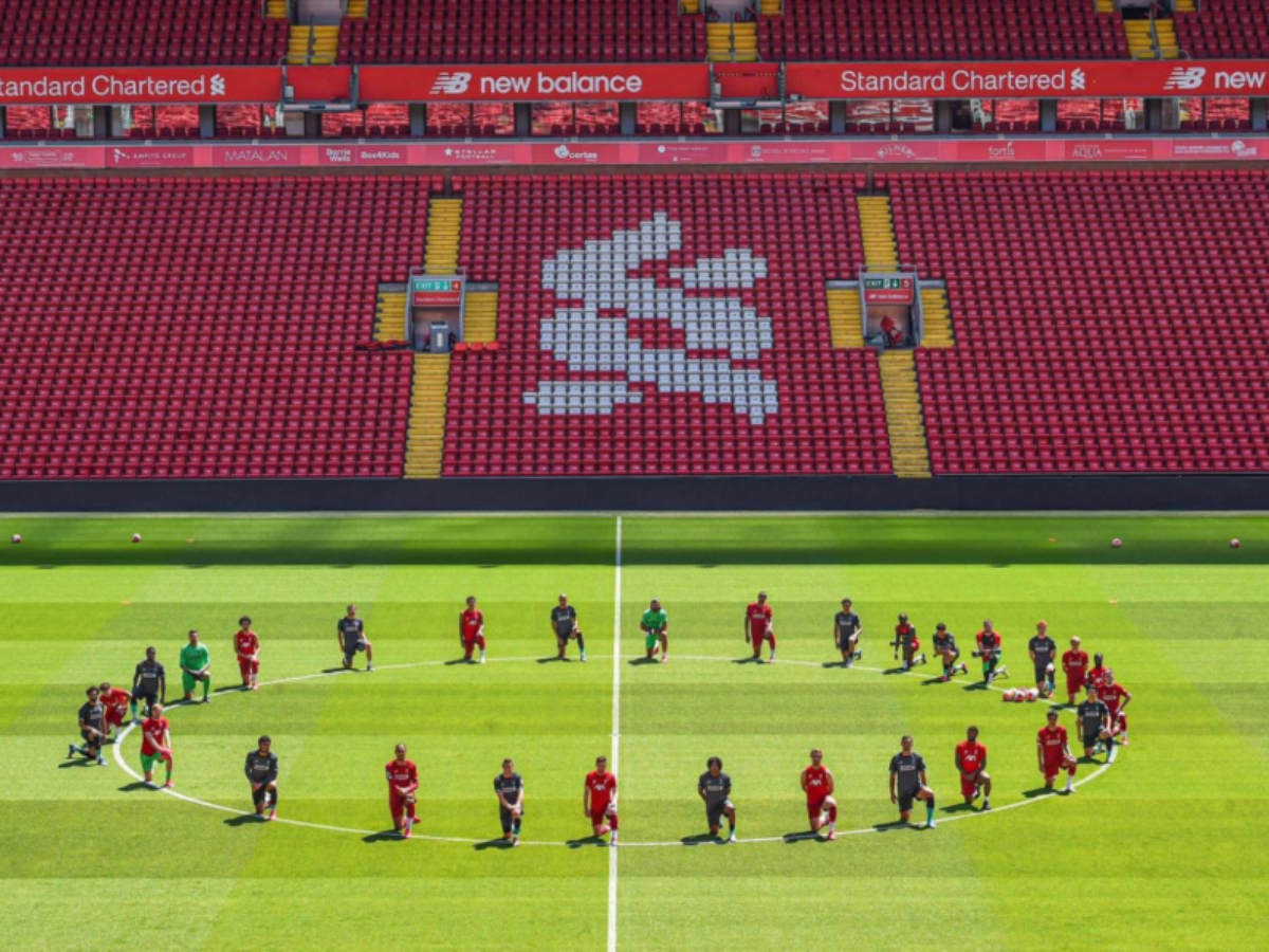Os jogadores se reuniram no círculo central do gramado do Anfield e se ajoelharam, manifestando-se contra o assassinato de George Floyd, ex-segurança negro morto brutalmente por um policial nos Estados Unidos.